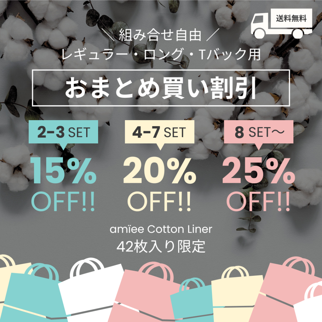 アミーの公式オンラインストアでは、使い捨て布ナプキン・布おりものシートである「コットンライナー」42枚入りを2セット以上購入すると割引になります。