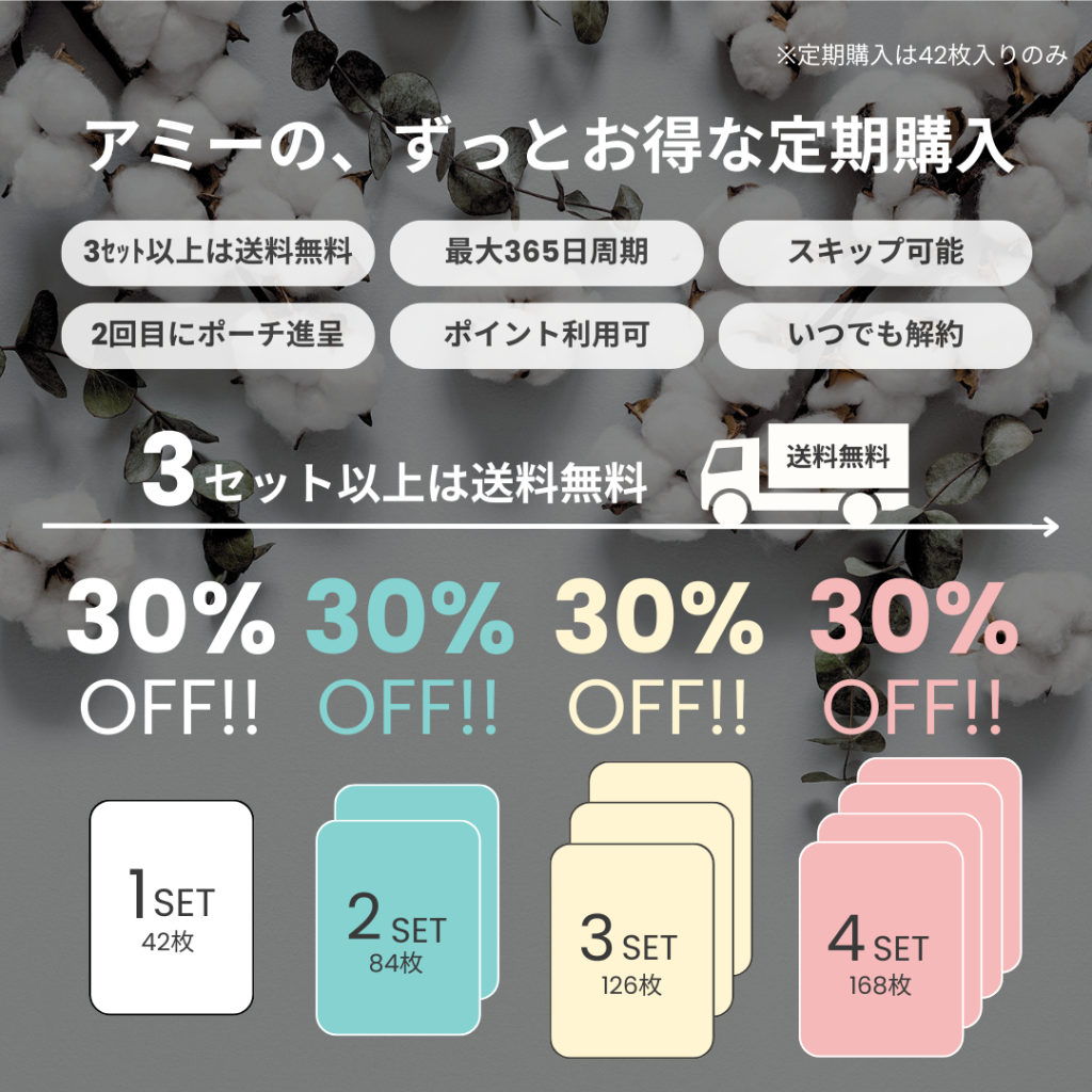 42枚入り限定で、30%OFFの定期購入サービスをご提供しています。1回のお届けが3セット以上の場合、【送料も無料】になります。お届けサイクルは最大365日に設定可能。マイページで簡単にスキップ設定もできます♪定期購入についてくるポイントは毎回のお支払いに充てられます(ご自身で設定いただきます)。